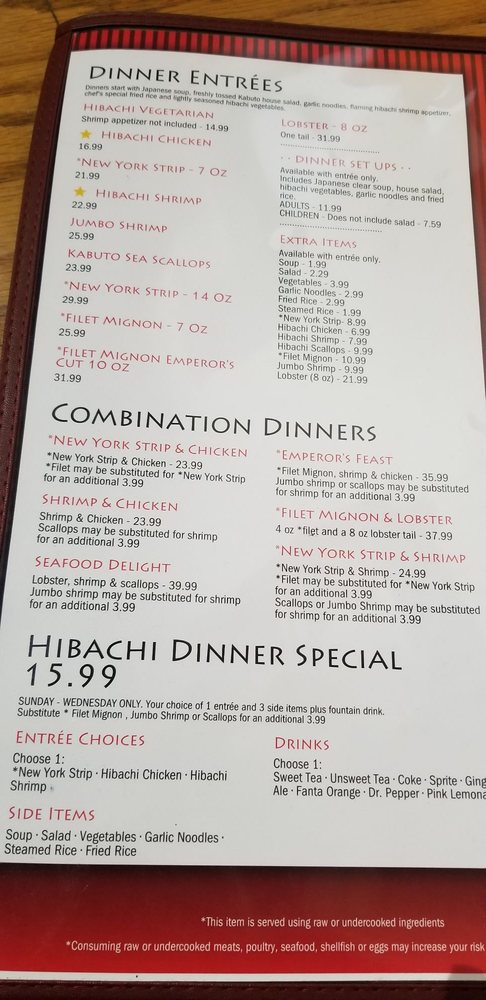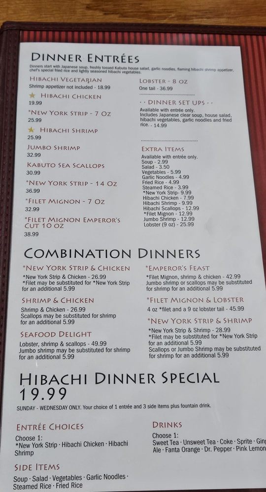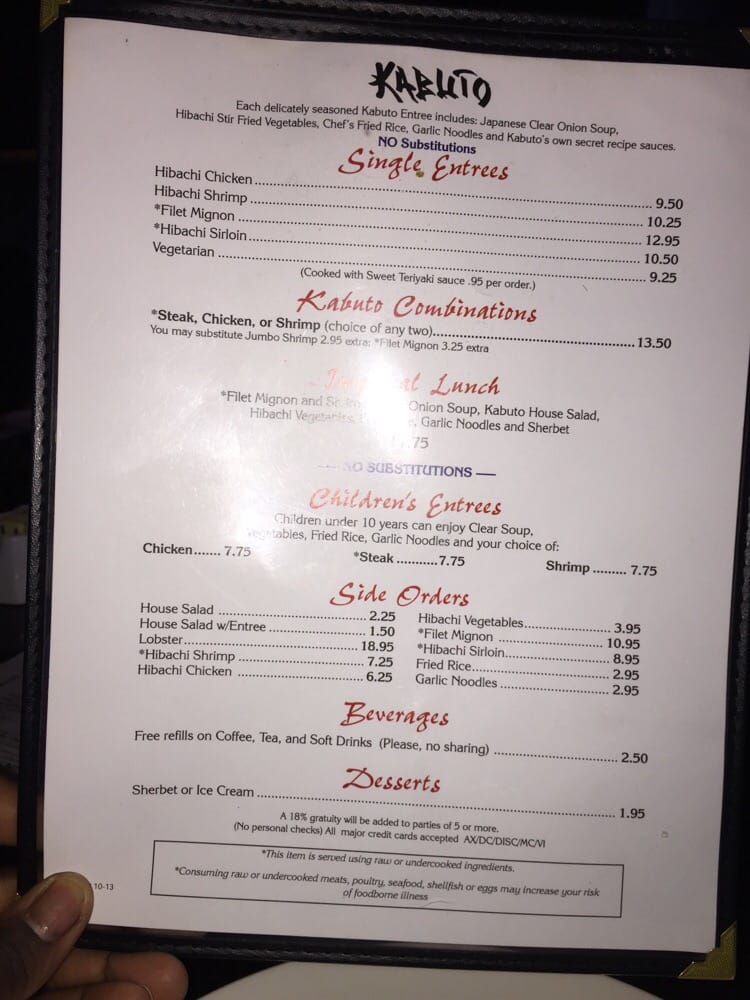 Includes hibachi stir-fried vegetables chef's fried rice and Kabuto's own secret recipe sauces.